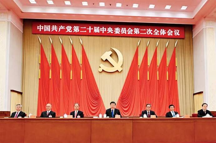 中国共产党第二十届中央委员会第二次全体会议,于2023年2月26日至28日在北京举行。这是习近平、李强、赵乐际、王沪宁、蔡奇、丁薛祥、李希等在主席台上。 新华社记者 谢环驰/摄
