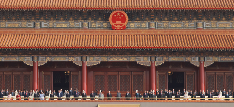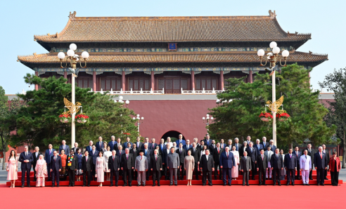 大会开始前,习近平和夫人彭丽媛在端门外广场迎接出席大会的外方代表团团长及其配偶,并同他们合影留念。