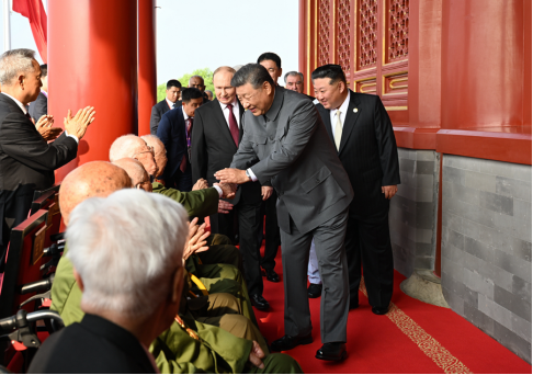 上午8时35分,习近平同出席大会的外方代表团团长拾级而上,登上天安门城楼。习近平同抗战老战士老同志代表亲切握手,向他们表示崇高敬意。