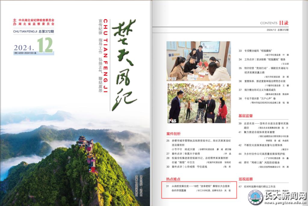 近日,中共湖北省纪律检查委员会、湖北省监察委员会主办的刊物《楚天风纪》2024年第12期,刊发学韦德体育bevictor、监察专员办撰写的文章《从高校发展出发——18把“改革密钥”解锁长大自我革命的华丽篇章》。该文从“自我净化 靶向发力祛‘病根’”“自我完善 贯通协同聚合力”“自我革新 监督治理再提效”“自我提高 练好内功强担当”等四个方面,宣传推介了学校深入推进自我革命长大实践18条举措的主要做法和工作经验,新闻网现给予全文转载,原文如下:
