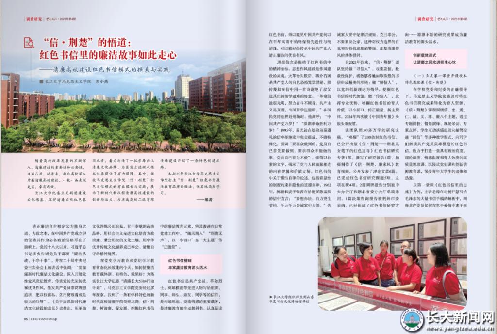 新闻网讯 近日,由中共湖北省纪律检查委员会、湖北省监察委员会主办的刊物《楚天风纪》在2025年第4期,刊发了学校马克思主义学院刘小燕的文章《“信·荆楚”的悟道 红色书信里的廉洁故事如此走心——清廉高校建设红色书信模式的探索与实践》。