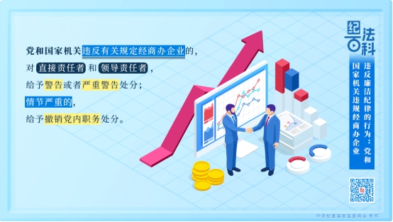 《中国共产党纪律处分条例》第一百零八条规定,党和国家机关违反有关规定经商办企业的,对直接责任者和领导责任者,给予警告或者严重警告处分;情节严重的,给予撤销党内职务处分。